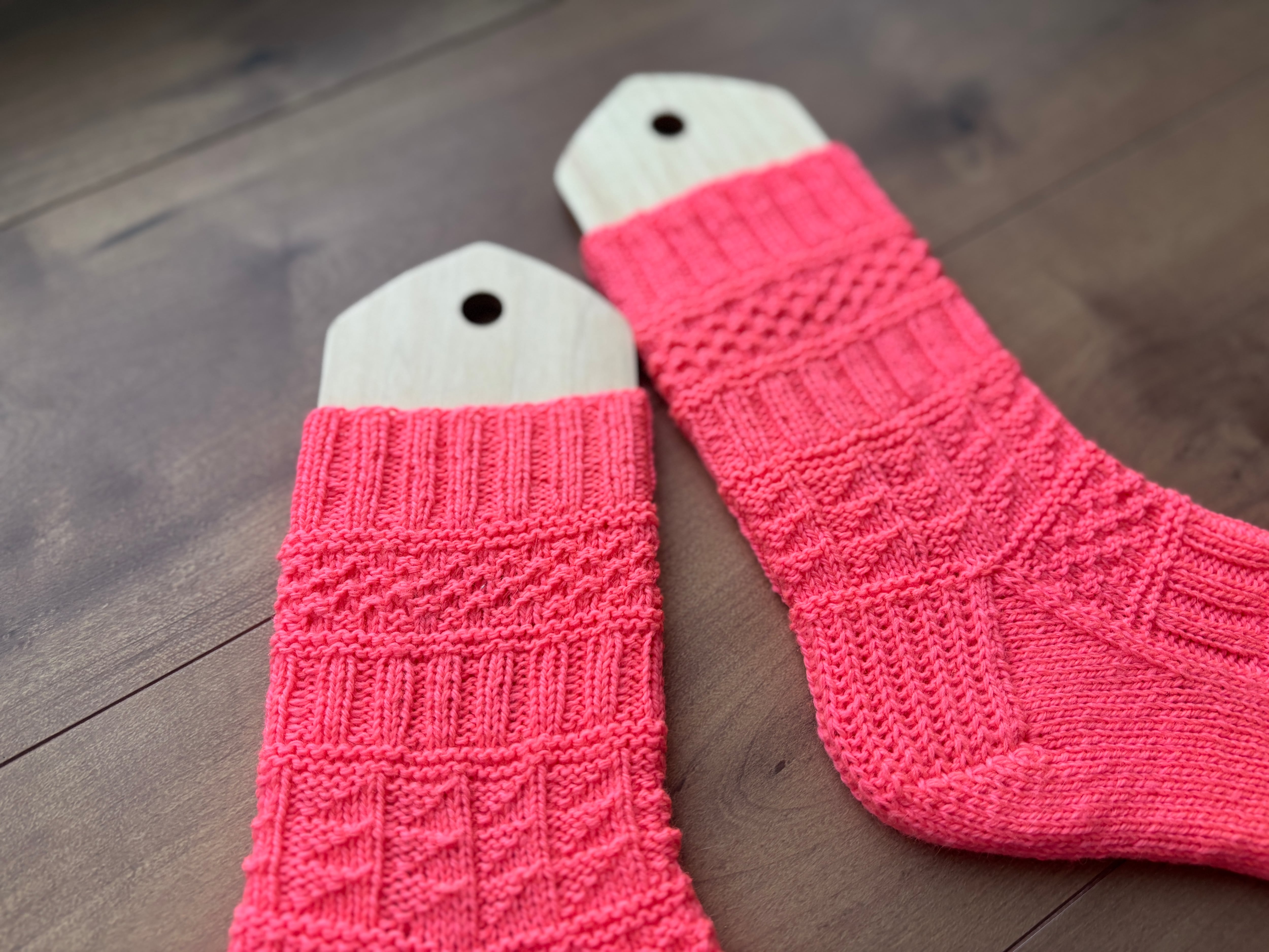 カフ(履き口)から編むカフダウンの靴下で、初心者の方にも編みやすいベーシックな踵を使ったパターンとなっています。