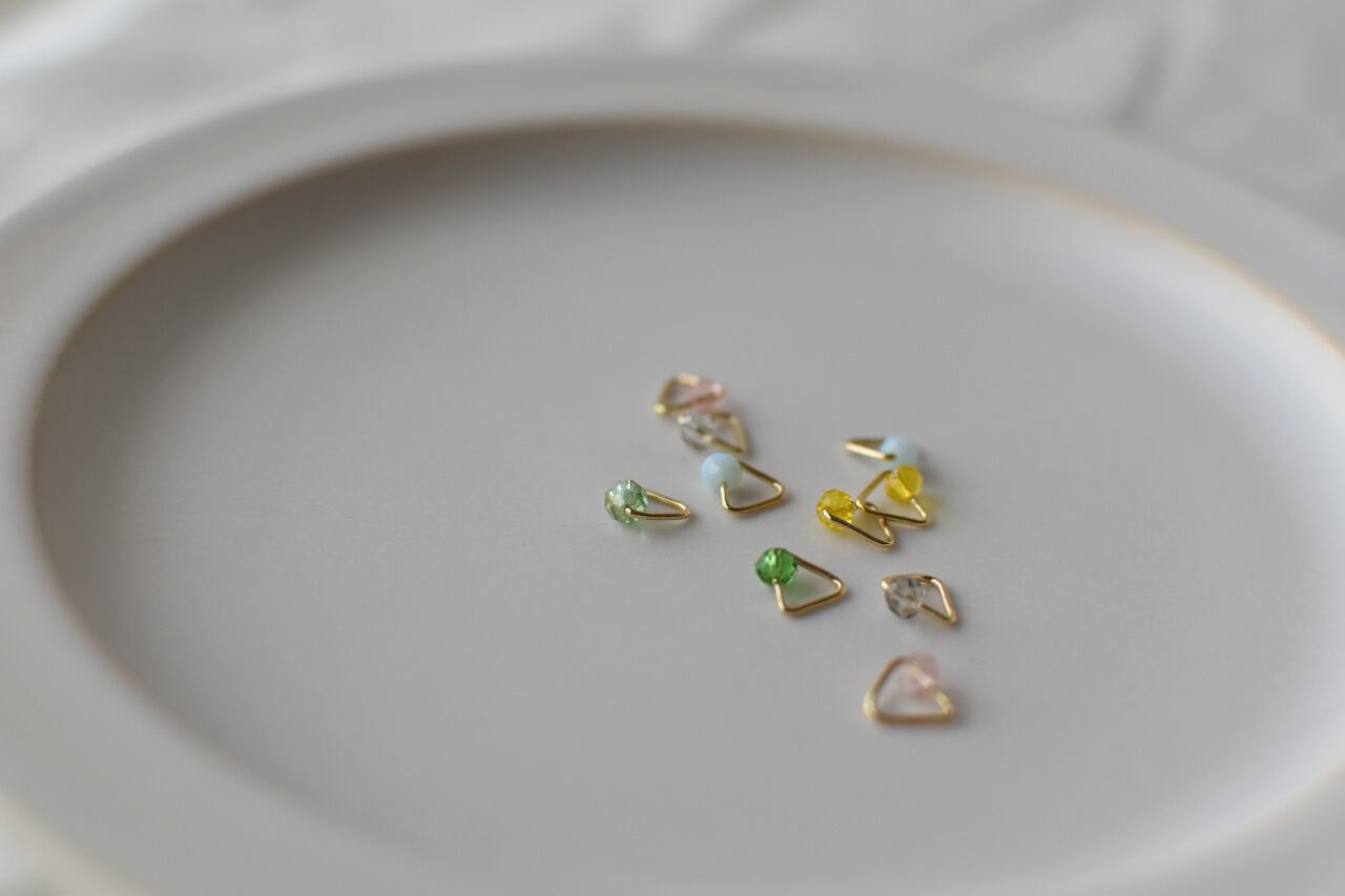 三角の金具に、ガラスのボタンカットビーズを合わせました。