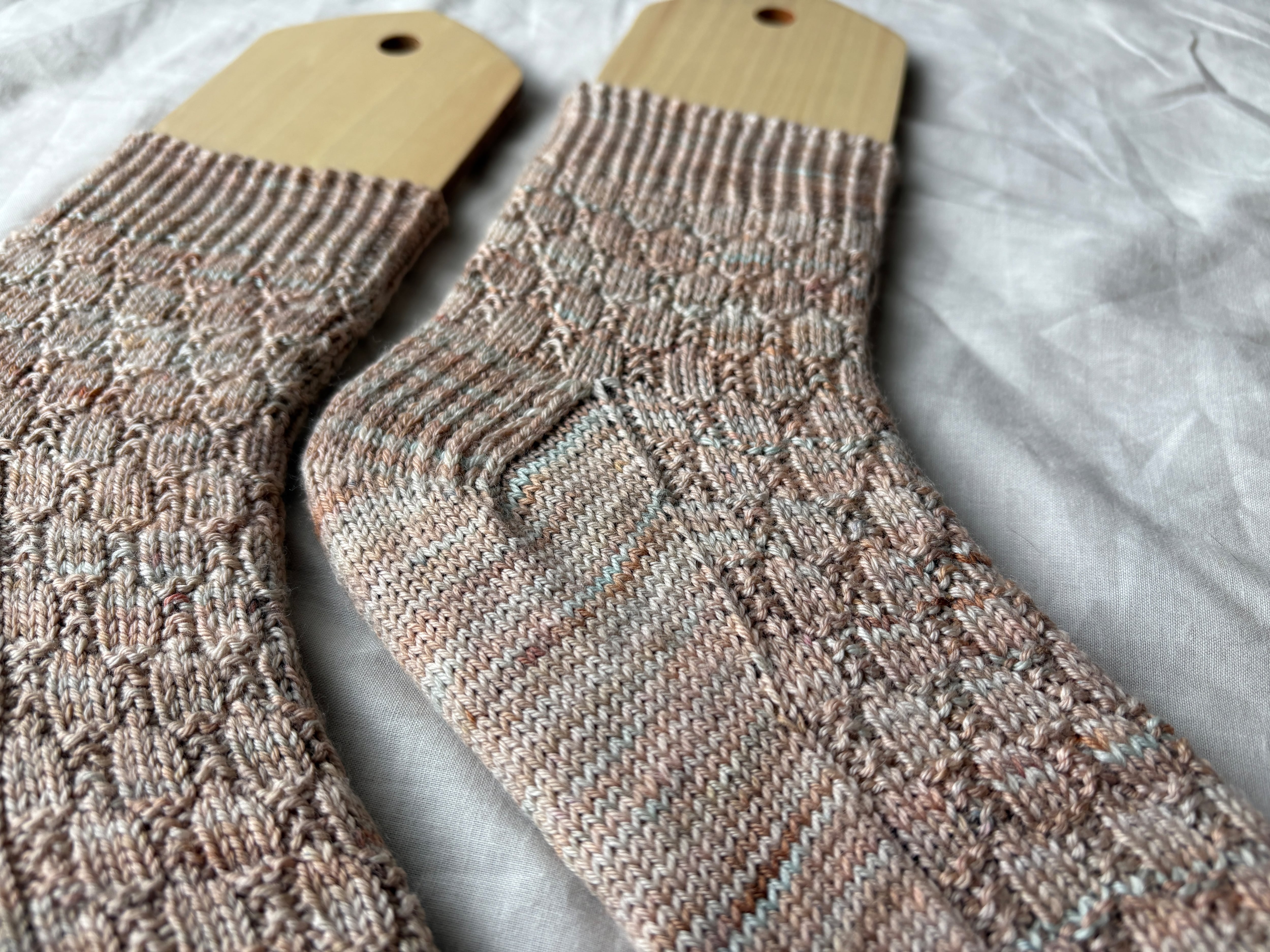 DLパターン:UROKO SOCKSは、靴下を初めて編む方に最適なデザインです。美しいうろこのような模様が特長です。